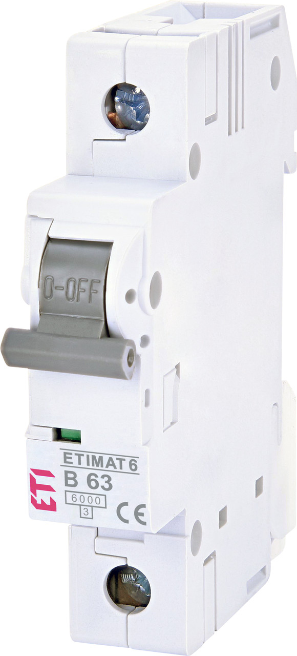 Автоматичний вимикач серії ETIMAT 6 відомого виробника (пристроїв захисту електрообладнання) ETI. 1-полюсний автомат, з номінальним струмом 63A, та струмом відключення 6kA. Стандартне кріплення на DIN рейку у модульні щити.
